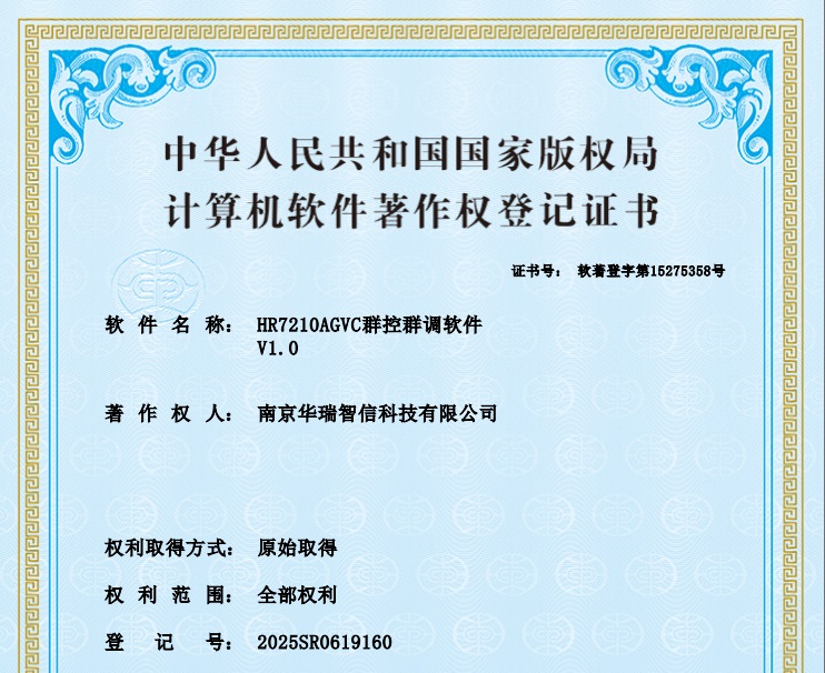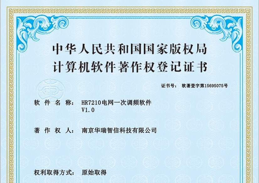 南京华瑞智信科技有限公司自主研发的HR7210电网一次调频软件V1.0已正式获得国家版权局颁发的计算机软件著作权证书。