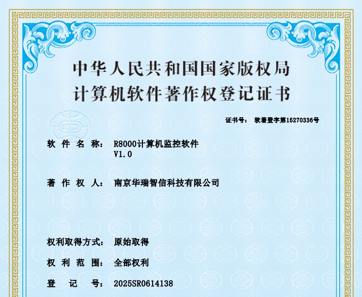 华瑞智信发布 HR8000计算机监控软件V1.0正式获得国家版权局软件著作权认证