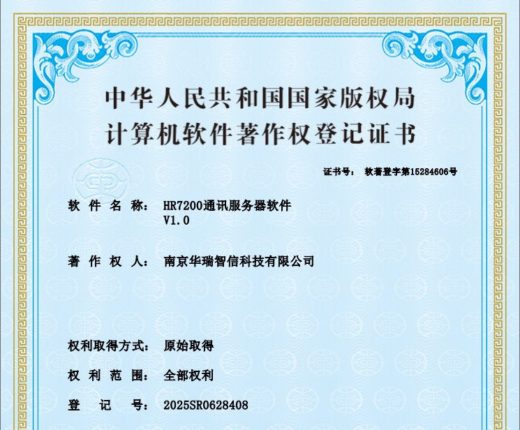 南京华瑞智信科技有限公司自主研发的HR7200通讯服务器软件已正式获得国家版权局颁发的计算机软件著作权证书。